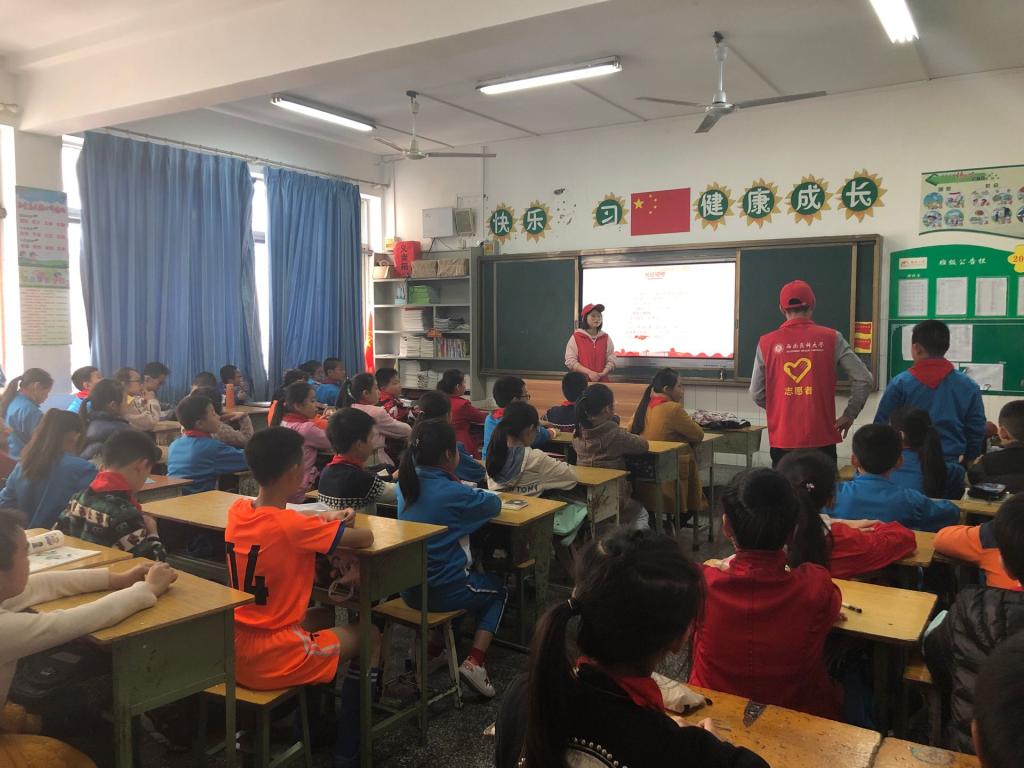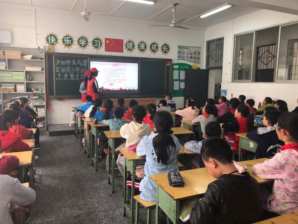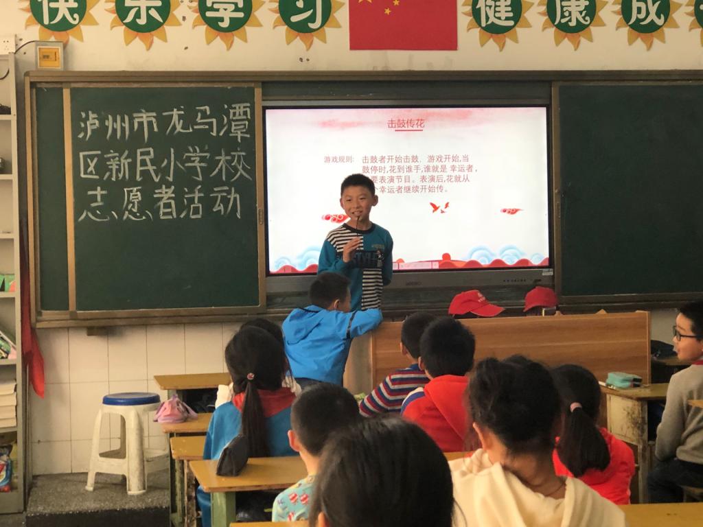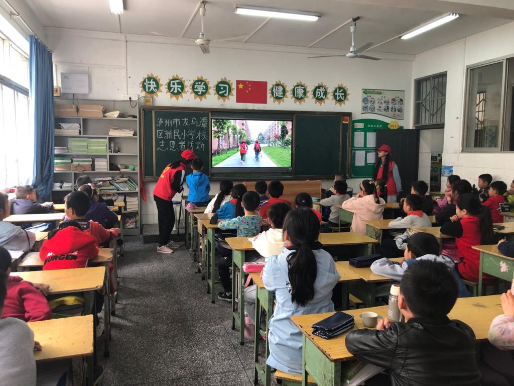 乘车半小时后,志愿者们终于在2点来到了泸州市龙马潭区新民小学处,与之前商谈的老师沟通好了,门口保安准许我们进入。一切工作道具与老师协调好了,我们的志愿者们便开始了宣讲。这次志愿对象是四年级的两个班,每个班分别指派两名同学进行宣讲,其余人员拍照。在向小朋友讲述红色文化-长征精神时,小朋友们都十分积极热情,举手回答问题。经历这次活动后,小朋友们对红色文化也有了一些新的认识。