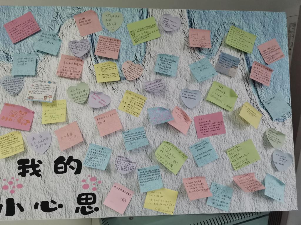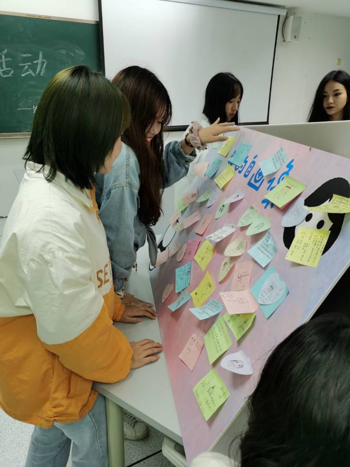 活动期间,我们在荟文楼306、307教室,设置了两块展板,一块名为“我的自画像”,供新生们把自我介绍的图文内容展示出来,一块名为“我的小心思”,让新生们写下自己的困惑烦恼。在这两间教室上课的公司其他同学,可以查看展板并留言。