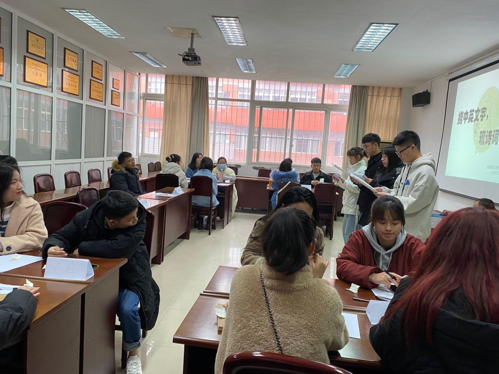 此次活动主题为“携中英文字,现诗词华彩”,分为成语英译、中文古诗词英译、英语美文中译三个环节,参与人员分四个小组展开翻译能力大比拼。前两个环节需要同学们首先根据图片猜出成语和诗句,再进行翻译,既考验了同学们对中华传统文化的了解,又考查了英汉互译的能力。猜出成语和诗句对同学们来说难度不大,但在翻译时如何选择韵脚,如何在忠实原文的基础上彰显意境,则让各小组陷入了激烈的讨论。