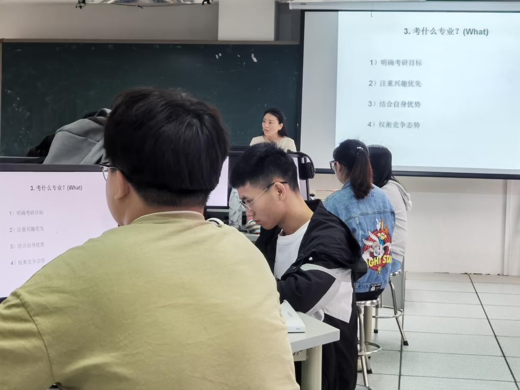 在考研指导环节,冯梅为同学们梳理了“考研是什么”、“为什么考研”两个问题,帮助同学们建立对考研的正确认知,明确考研的内驱动力。她重点围绕“如何确定公司和专业”、“如何备考”展开指导,结合自身考学深造和往届员工的考研经验,详细介绍了考研决策和备考复习的注意事项。她还要求同学们要明确目标,尽快汇总意向公司和专业的信息,以便后期联合公司其他教师开展对口跟踪指导。