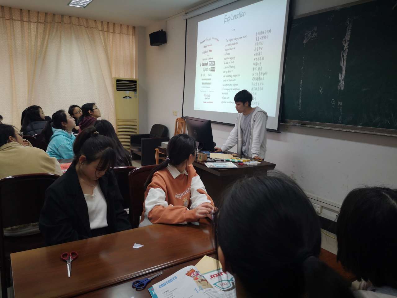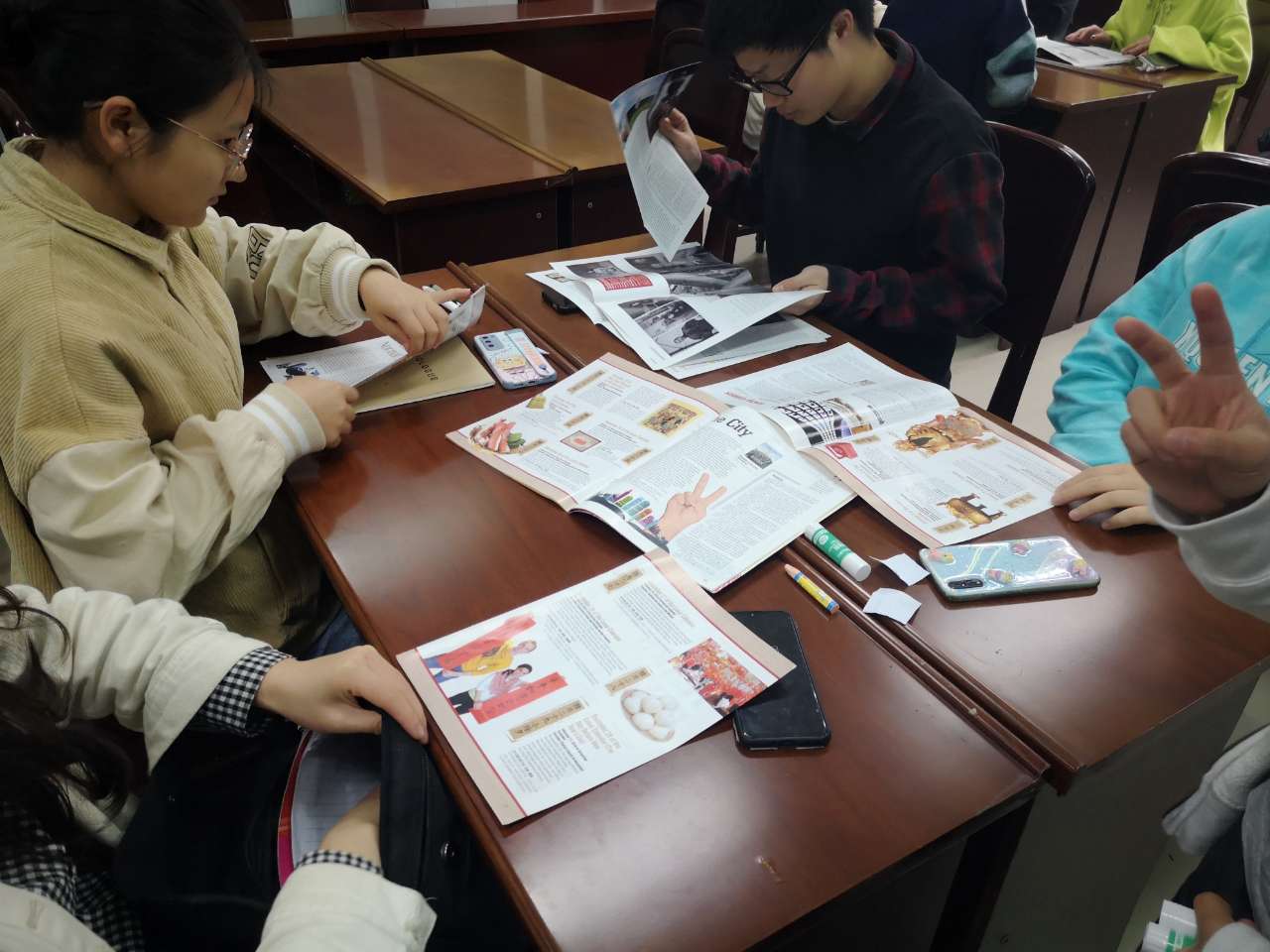 活动中,主持人首先向同学们介绍了拼贴诗的创作方法,并提供了英文杂志、报刊和剪刀、胶水、卡纸、彩笔等作为创作材料。之后同学们现场组队,集体构思创意,确定主题内容后挑选素材开始剪切、拼贴,创作独一无二的英文诗作。