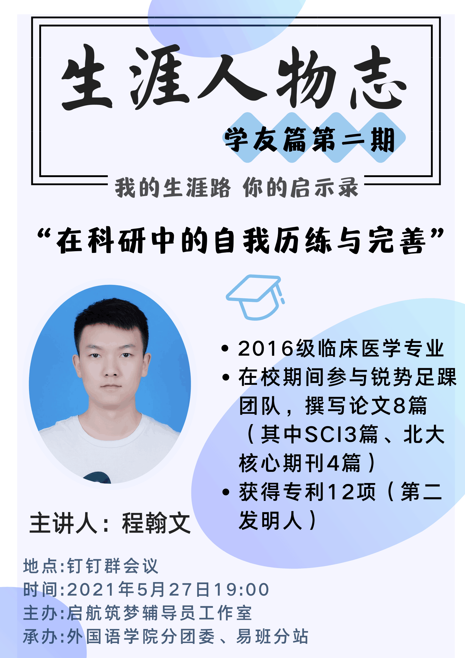5月27日晚7点,由启航筑梦辅导员工作室主办、bevictor伟德官网分团委和易班分站承办的“生涯人物志”系列讲座·学友篇第二期(总第三期)活动通过钉钉平台如期举行。本次讲座邀请了伟德国际唯一官网入口2021届临床医学专业毕业生程翰文在线分享老员工涯发展规划历程,来自全校各年级、专业的295名同学参与了讲座。