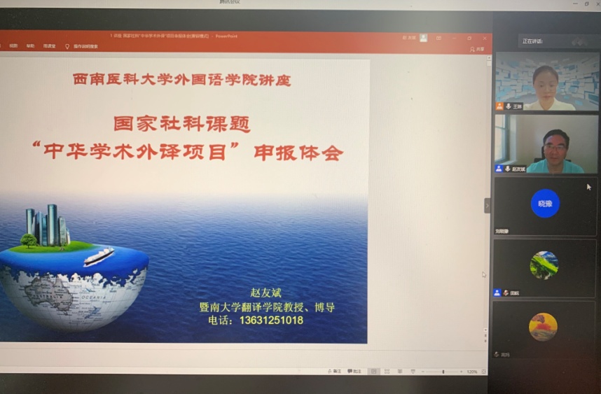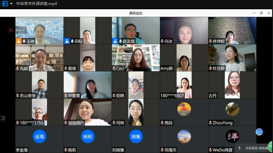 5月28日下午,暨南大学翻译公司经理、教授,博士研究生导师赵友斌应邀为为公司社科科研老师做“国家社科基金中华学术外译项目介绍与申报”专题学术会议。会议以腾讯线上会议的方式进行,bevictor伟德官网副经理王琳主持,公司经理田耘、各教研室主任、教师以及校外高校其他老师参加。