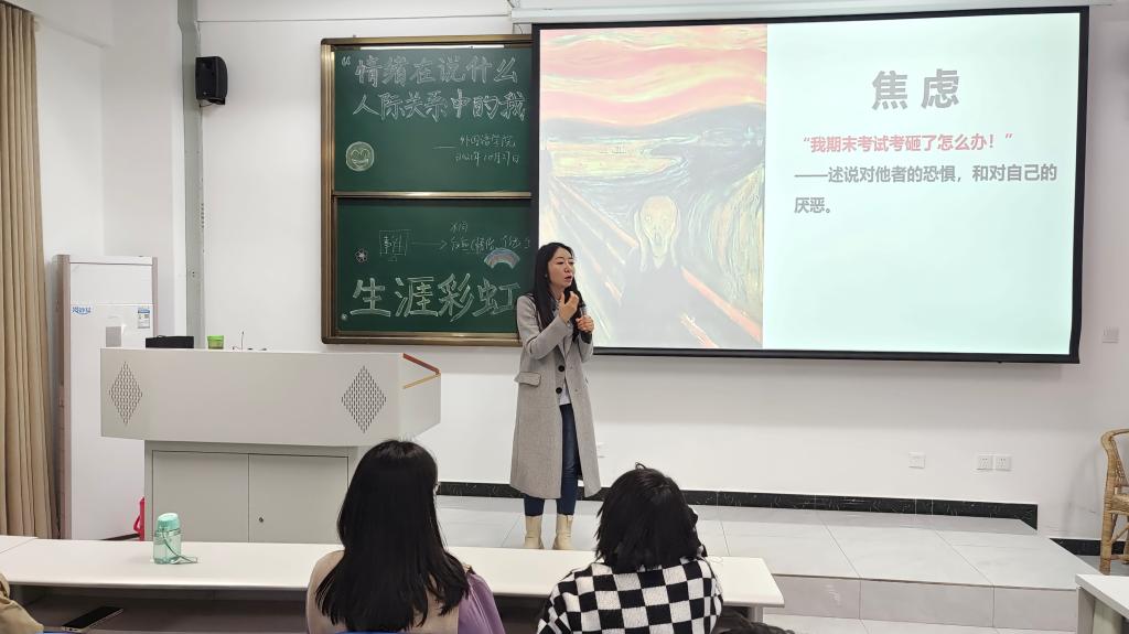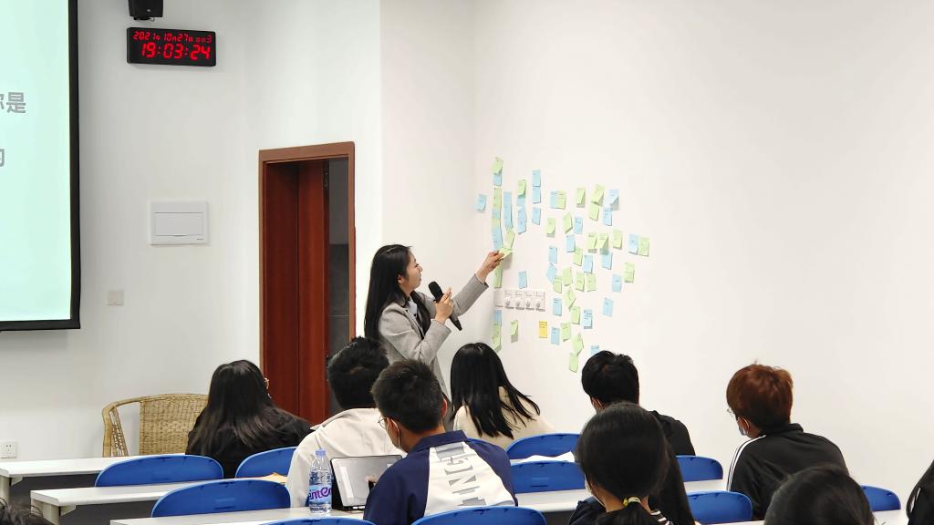 讲座题目为“情绪在说什么——人际关系中的我”。宋杨首先请同学们在纸条上写下自己的焦虑和解决办法,把它们粘贴在墙上,通过对比分析,她引导同学们思考“怎样正确对待焦虑”。随后,她以“狐狸吃葡萄”进行趣味测试,告诉同学们“情绪没有对错,重要的是如何控制情绪”。之后,她结合自己14年的心理咨询经历,谈及“通过情绪了解自己(本质)”这一话题。最后,她强调情绪管理在我们日常学习和生活中非常重要,希望通过这堂课,同学们能够敏锐感知自己的情绪,并有效进行管理。