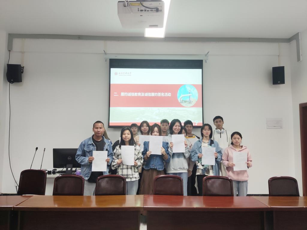 公司生活部干事余静楸带领大家共同学习助学贷款相关文件,强调了按时还款、诚信履约的重要性。随后,在主持人的组织下,同学们在《诚信履约承诺书》上郑重签名。