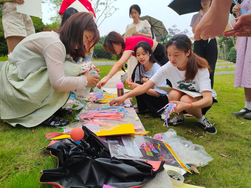 活动一开始,同学们首先进行自我介绍拉近彼此距离。之后大家围坐在草地上,运用手中的卡纸、剪刀,展开想象,用手工拼贴的美术方式描绘自己心中的未来。在所有同学完成作品后,大家互相展示自己的创作成果,讲述自己的灵感来源,分享活动感悟。最后,大家带着作品完成合照,并对现场环境卫生进行清扫。