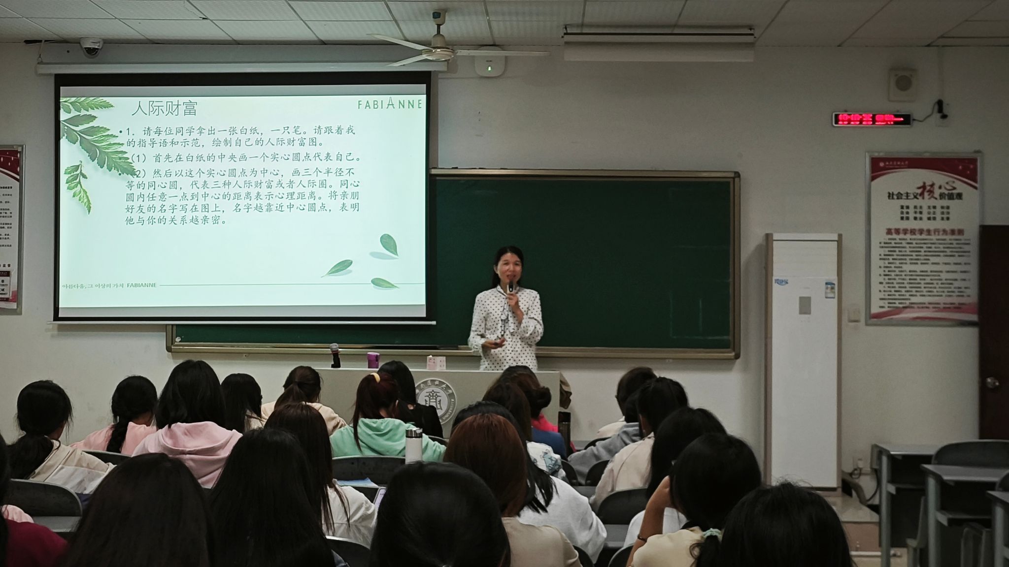 首先,冯淑丹以一系列有趣的小故事引入话题,增进同学们对生命联结与人际关系的理解,并邀请同学们分享各自对于人际关系的看法。而后,冯淑丹对人际交往的概念作了具体阐述,以绘制人际财富、填写情感账户的方式帮助同学们理清自我人际关系。最后,冯淑丹向同学们推荐了人际关系相关书籍,希望同学们能通过书籍,深层次了解人际交往技巧,开拓社交视野。