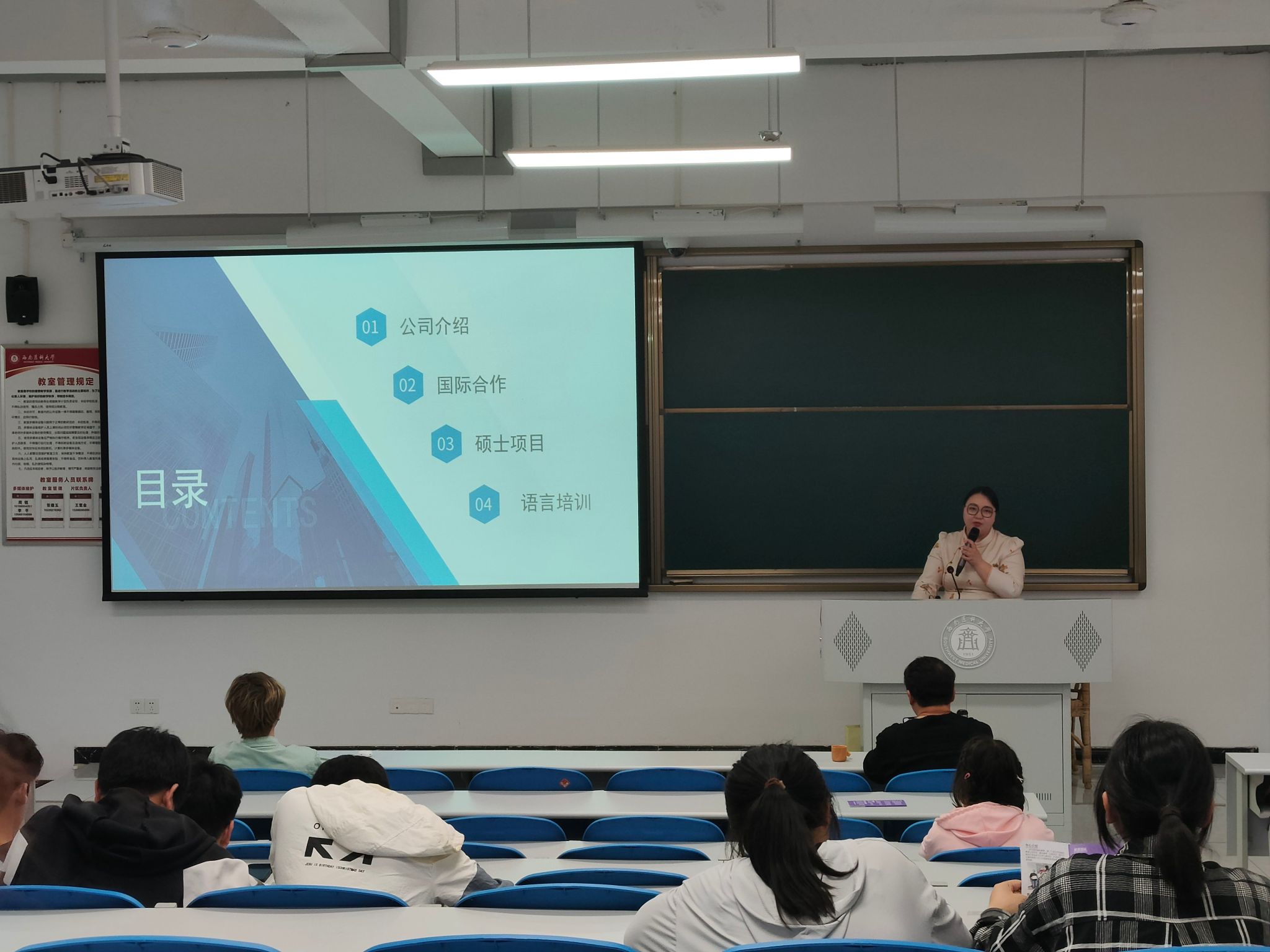 汪洁简要介绍了泸州雅思国际教育的简要情况,包括主要业务和国际合作对象,让同学们对该公司有了大致的了解。汪洁还介绍了该教育机构的业务特色和企业发展前景。随后,汪洁就公司的岗位需求状况进行了介绍,提出应聘该企业的条件要求,鼓励同学们发展自我能力,大胆进行就业尝试。最后汪洁还对同学们在就业中的疑惑进行了针对性讲解,提出了许多可行性意见。