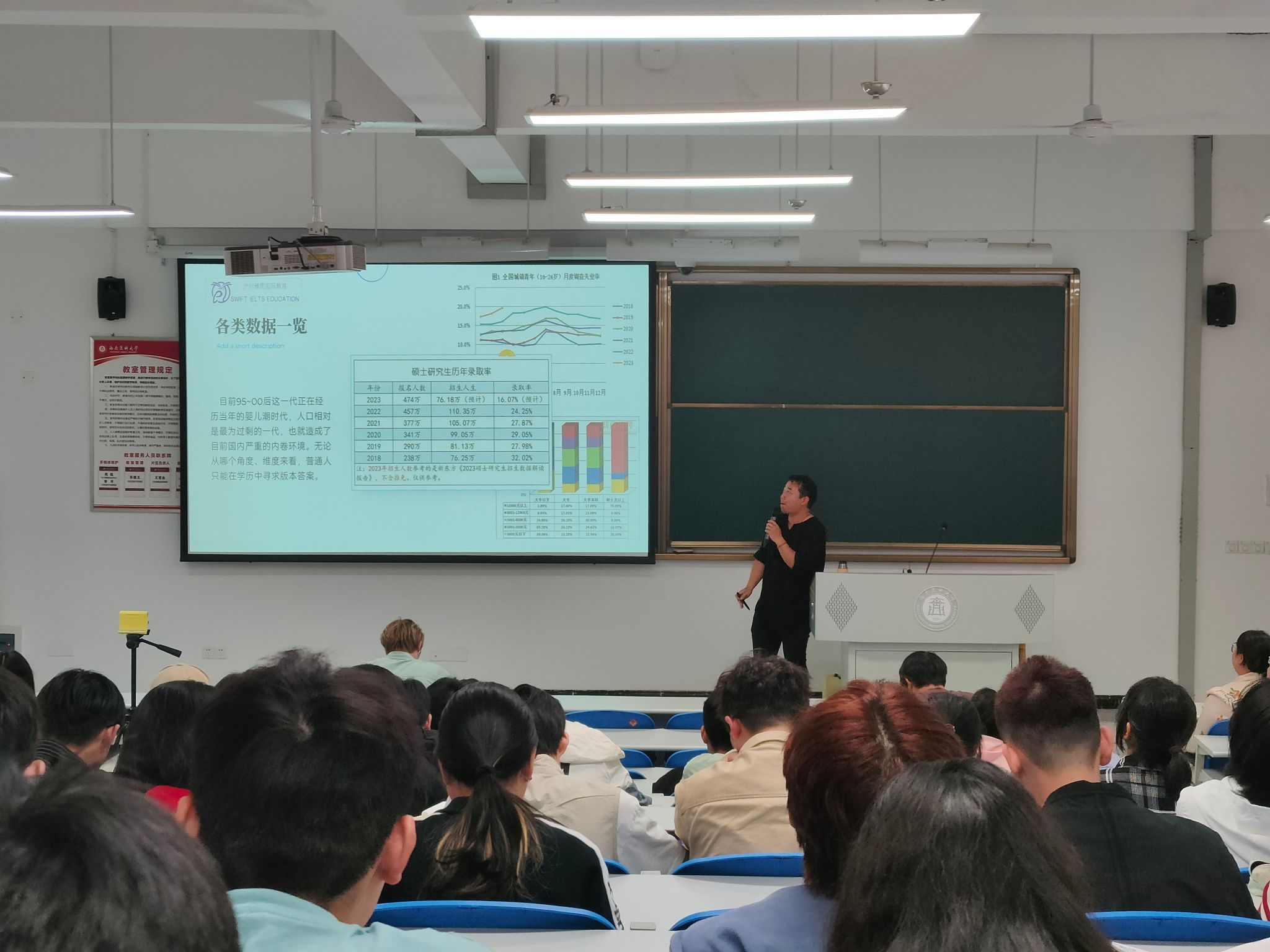 刘思阳从目前留学信息、国内升学就业及人生思辨等角度出发,结合自身留学经历、工作经验向同学们简单阐述了留学信息获取的必要性和重要性,引导打破对于留学门槛的固有观念,并分析了我国职工主要留学国家的基本情况,让同学们对留学途径及方向有了更深的了解。在随后的问答环节中,同学们踊跃提问,刘思阳针对问题结合自身留学经历一一详细解答。活动最后,刘思阳就“摆烂”,“学历”,“勇气”三方面展开讲解,为同学们提供了许多新颖的留学思考方向,现场气氛活跃,同学们反响热烈。