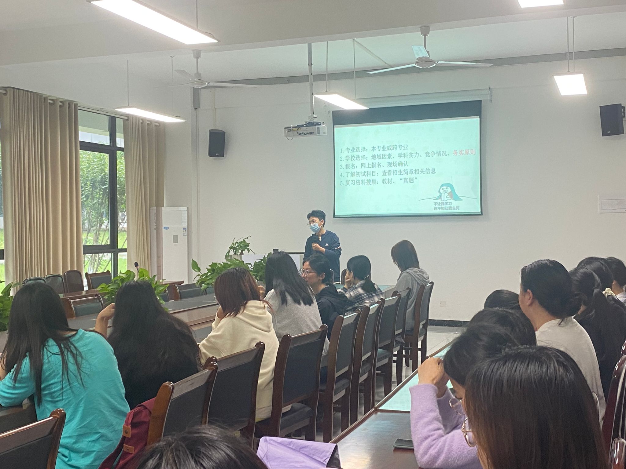 徐臻结合自身求学和教学管理工作经验,以考研信息解读为主线,从“为什么要考研”“如何准备考研”“考研有哪些需要注意的关键事项”三个方面,向同学们进行了讲解,同时提出了许多建设性意见。徐臻从考研的目的、意义和重要性入手,结合近几年的考研形势,分析了备考要点。徐臻强调,应首要明确目标专业、院校,随后进行资料和复习准备,科学高效地备考。