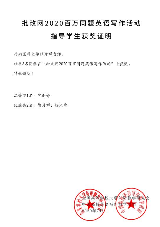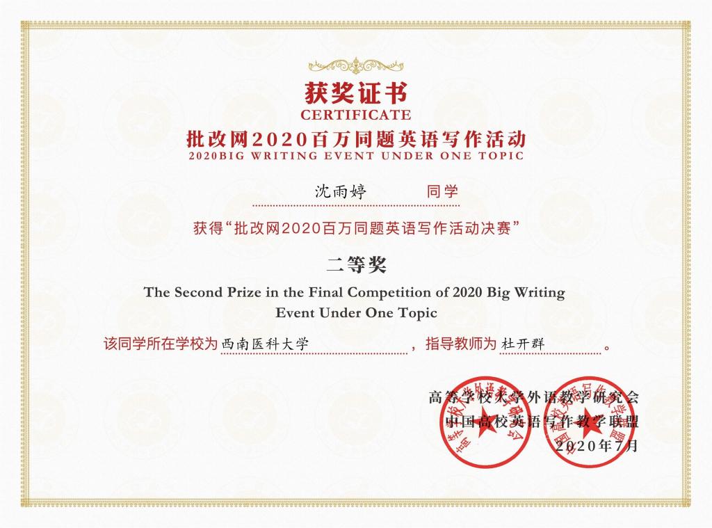 公司员工喜获“批改网2020百万同题英文写作活动”二等奖