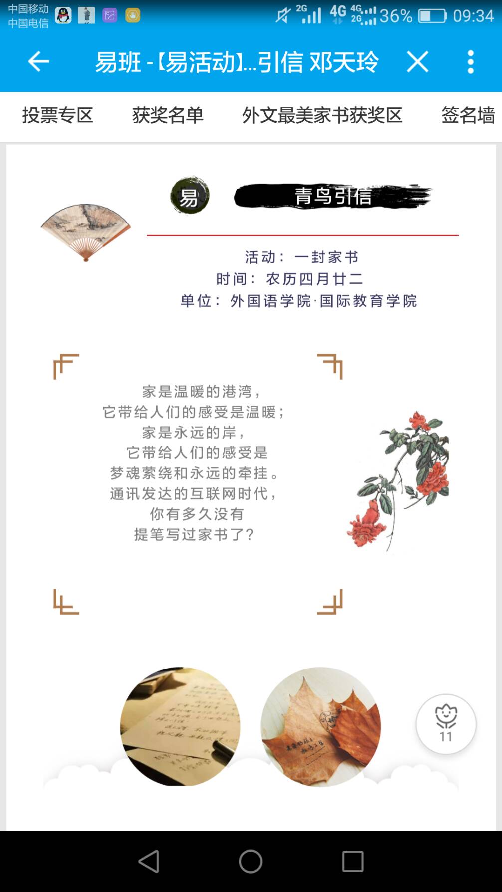 写一封家书,传递浓浓的亲情;写一封家书,给予厚厚的温暖;写一封家书,寄给这世上最挂念你的人。2018年6月4日-6月6日,外国语学院通过易班平台开展了一次“青鸟引信——一封家书”的活动,一封封散发着温馨的信笺,一句句真挚问候的话语落到父母的心坎上。